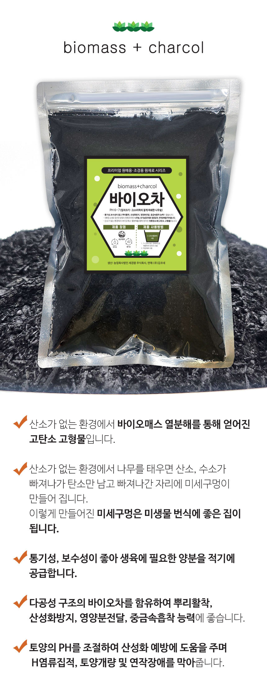 참나무, 소나무 숯으로 제작된 고탄소 고형물입니다.